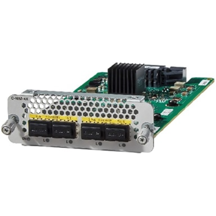 Cisco C-NIM-4X — це модуль наступного покоління 1G/10G LAN/WAN із локальними можливостями комутації Layer 2 на всіх чотирьох портах. Він забезпечує недорогий 4-портовий LAN-комутатор Layer 2 з підтримкою чотирьох портів Small form-Factor Pluggable (SFP)/SFP+ зі швидкістю до 10 Гбіт/с. Два порти з найвищими номерами можуть бути налаштовані для нативної роботи на Layer 3. Налаштування портів на Layer 3 забезпечує повну функціональну сумісність із вбудованими WAN-портами маршрутизатора.