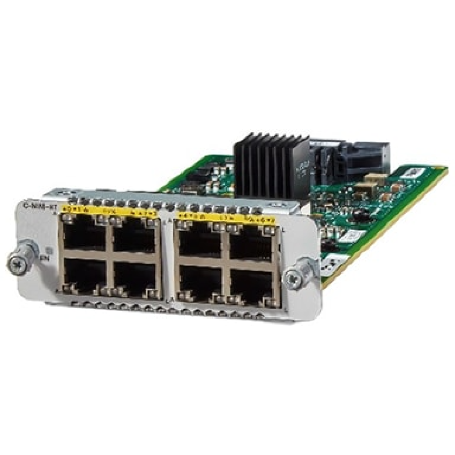 Cisco C-NIM-8T — це LAN/WAN модуль із восьми портами RJ-45 для мідних ліній. Він призначений переважно для заміни модулів NIM-ES2 серії ISR 4000, з якими має повну функціональну сумісність у роботі на Layer 2, а також включає додаткові можливості Layer 2. Модуль підтримує Ethernet-з’єднання 10BASE-T, 100BASE-TX та 1000BASE-T, забезпечуючи недорогий 8-портовий LAN-комутатор.