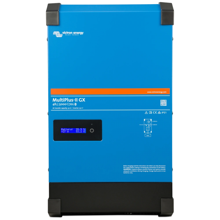 Інвертор/зарядний пристрій із вбудованим мережевим пристроєм MultiPlus-II GX взаємодіє з сонячним зарядним пристроєм, батареями та іншими пристроями для керування підключеною до мережі, автономною або віддаленою установкою живлення. Можливість паралельної роботи для збільшення вихідної потужності або швидкості заряду батареї, MultiPlus-II GX також може бути налаштована на трифазне живлення. Безліч розширених функцій, таких як безперебійне живлення, встановлення обмежень навантаження та доповнення обмеженої доступності електромережі живленням від батареї, можна керувати прямо з вашого телефону чи смарт-пристрою. Також можливий віддалений моніторинг.