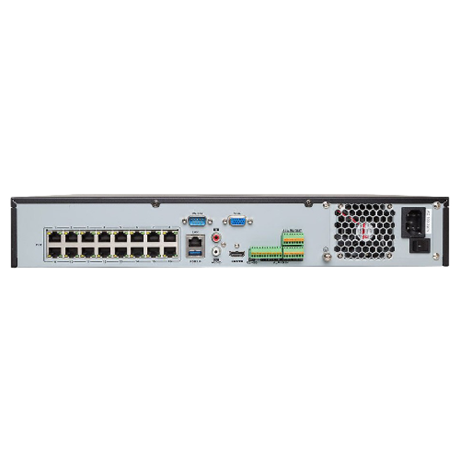 Реєстратор має можливість одночасного підключення до 16 IP камер з РоЕ живленням по витій парі. Максимальна роздільна здатність підключається IP камери 4К (3840x2160). Для збереження відеозаписів можна встановити 4 жорстких диска SATA максимальним обсягом до 6 ТБ кожен (всього до 24 ТБ).