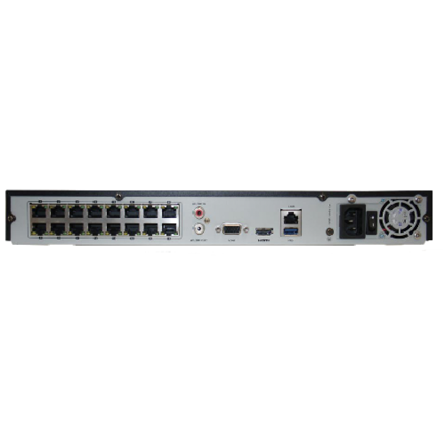 Реєстратор має 16 РоЕ портами з можливістю одночасного підключення до 16 IP камер з живленням по витій парі. Для збереження відеозаписів можна встановити 2 жорстких диска SATA максимальним обсягом до 4 ТБ кожен (всього до 8 ТБ).