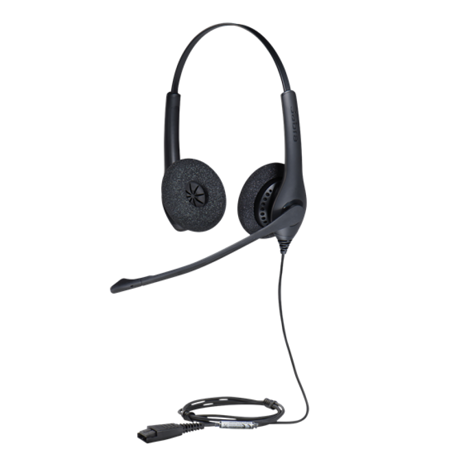 Jabra BIZ 1500 Duo QD (1519-0154) - гарнітура на два вуха з поролоновими амбушюрами, підключення через QD, широкосмуговий звук, гнучка штанга мікрофона, наявність кнопки відповіді та регулювання звуку на шнурі гарнітури.