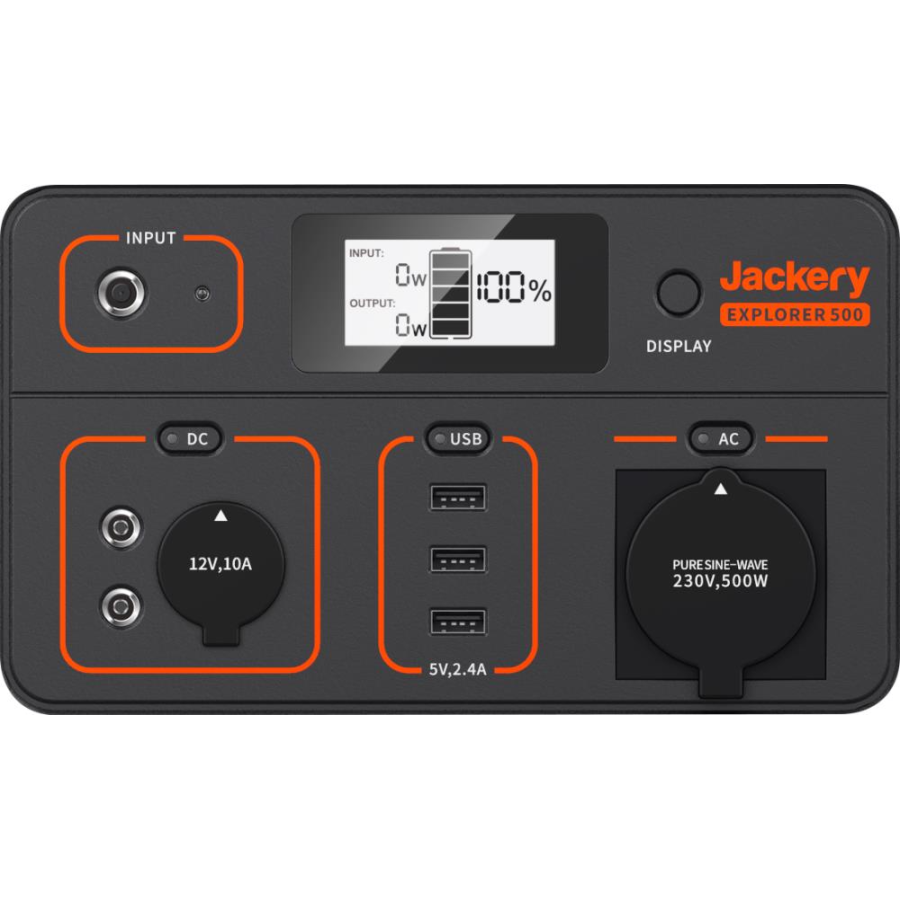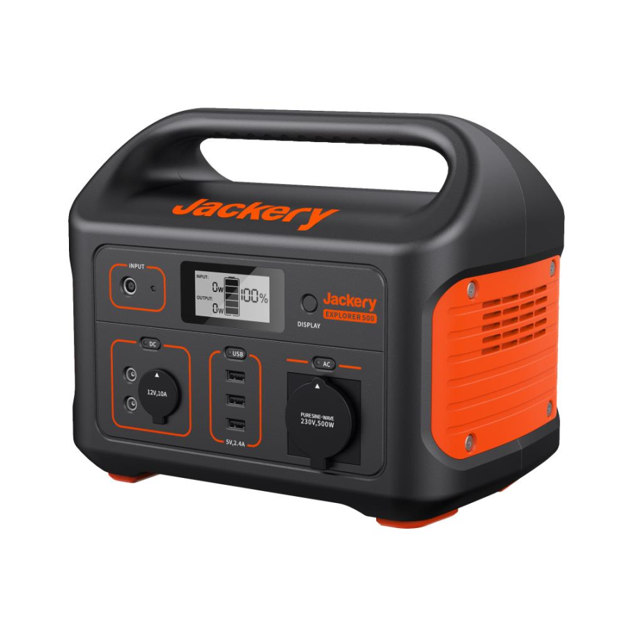 Jackery Explorer 500 має літій-іонний акумулятор ємністю 518 ват-годин (24 Ач, 21,6 В) та інвертор з чистою синусоїдою. Він має 1 розетку змінного струму (110 В, 500 Вт, 1000 Вт пік), 3 порти USB-A, 2 порти постійного струму та 1 автомобільний порт для підключення малопотужних та потужних приладів, включаючи міні-холодильник, повітряний насос та телевізор. Портативна електростанція Jackery Explorer 500 розміром з баскетбольний м'яч та має міцну ручку. Зручний для перенесення та компактний дизайн роблять Jackery Explorer 500 ідеальним для кемпінгу на колесах та поїздок на автомобілі.