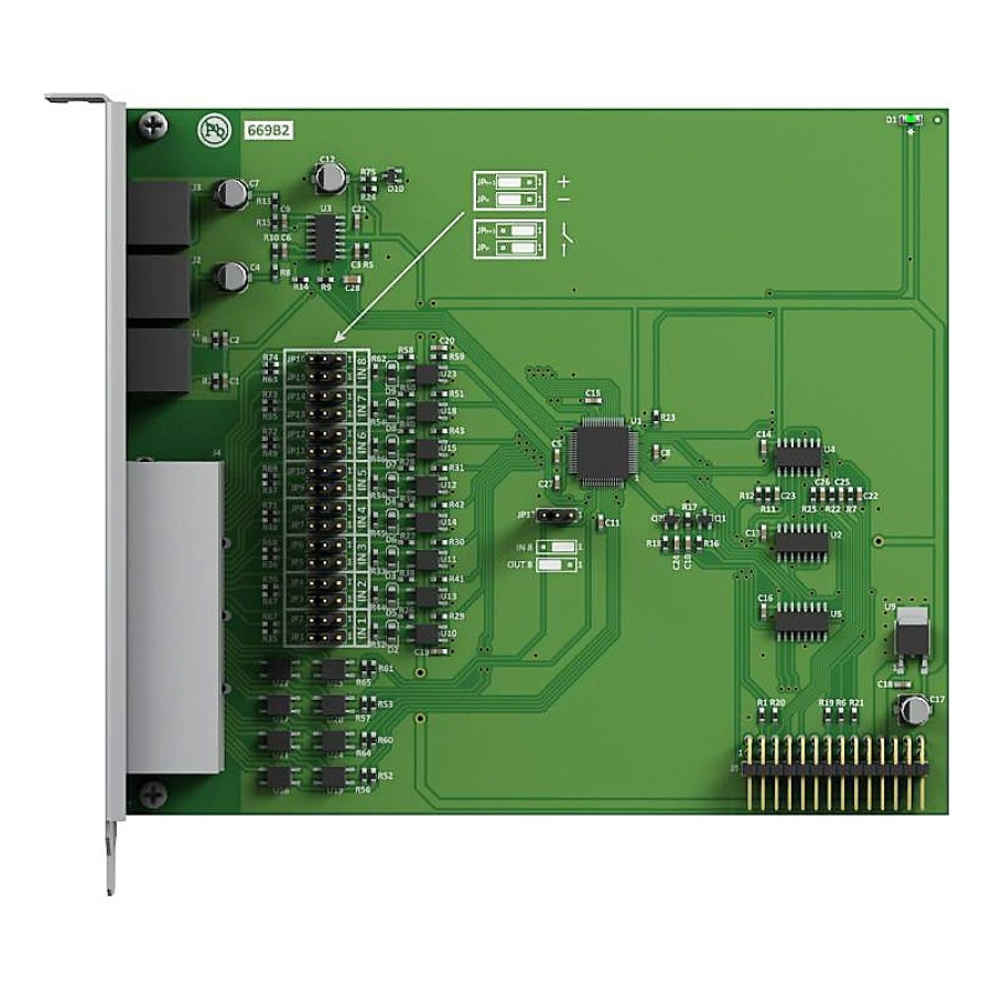 Плата керування до 8 зовнішніх пристроїв, до 8 датчиків, 2 виходів аудіо (наприклад, для радіовузлів) та 1 входу аудіо. Для керування зовнішніми пристроями потрібен адаптер з реле
